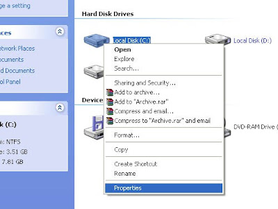 Step 1 : Goto My computer, Right click on the disk drive and select properties.